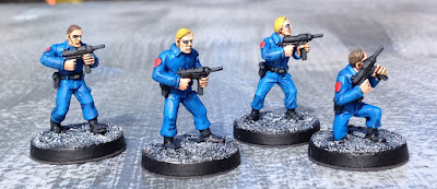 An assortment of fourteen 28mm Minions by Crooked Dice. They can fill a wide variety of roles in games such as henchmen of an evil mastermind, security guards, crew of a space station/undersea base/oil rig, etc. They mix well size-wise with the Copplestone guards in orange uniforms that I posted back in 2013. I was not thrilled how the orange uniforms turned out on the Copplestone guards, so after some experimentation I decided to go with blue uniforms. I started with Coat d'Arms High Elf Blue, added a coat of Army Painter Blue Tone ink, then highlighted in the original color. I like how they turned out. Painted in 2017.
